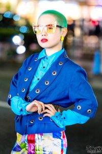 Shaved Blue Hairstyle & Vintage Fashion in Harajuku