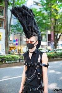 Guy with tall mohawk wearing punk fashion with body harness.
