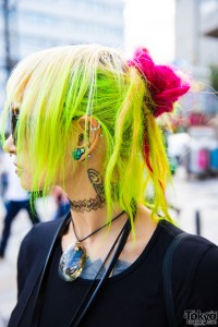 Neon Green and Pink Hair, Gauged Ear, Ear Cuffs