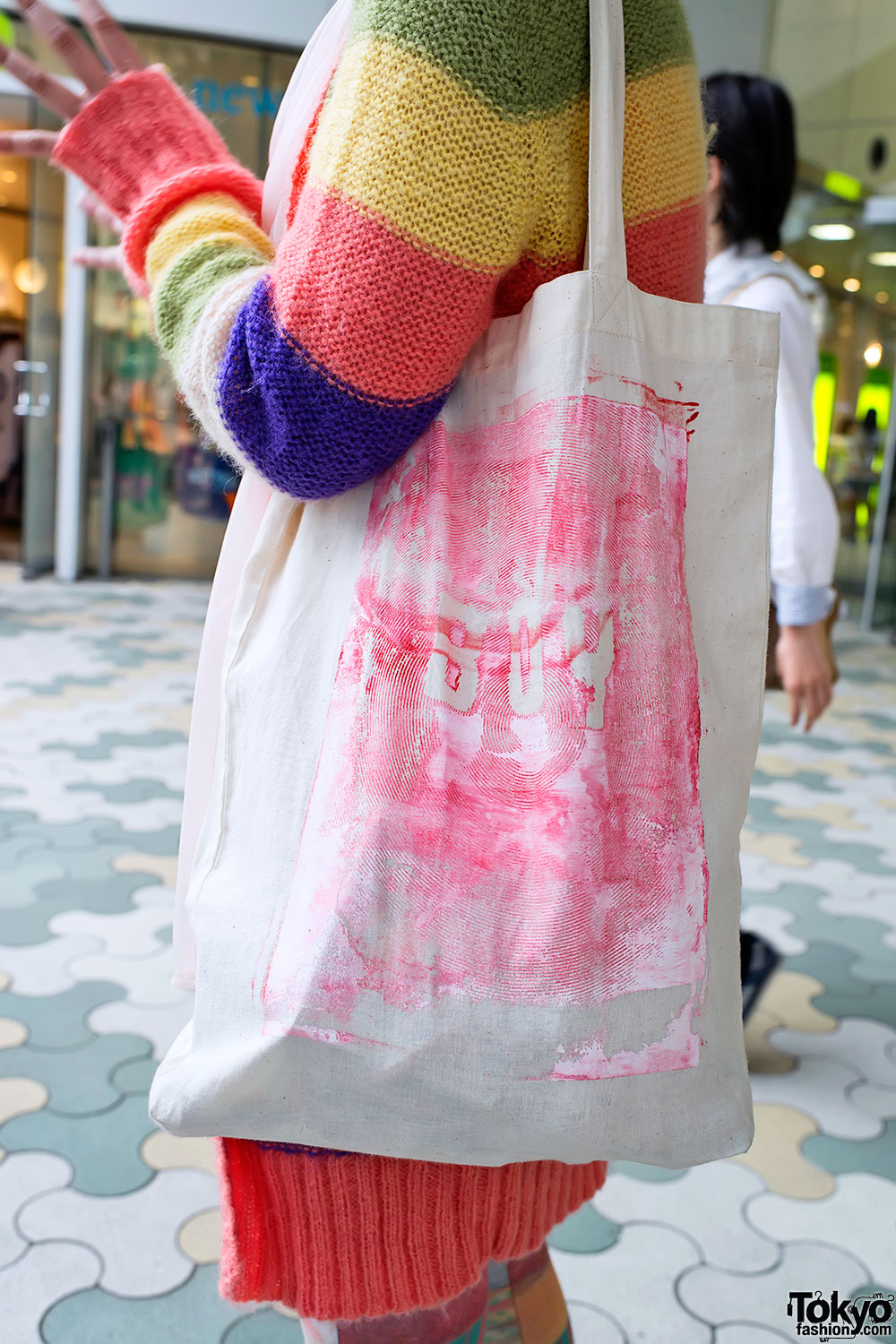 She’s wearing a long knit sweater striped in pastel colors, a pink and white sheer top, white lace shorts, graphic tights and low-top Converse sneakers. Accessories include a delicate necklace and a screen printed canvas bag from BOY.